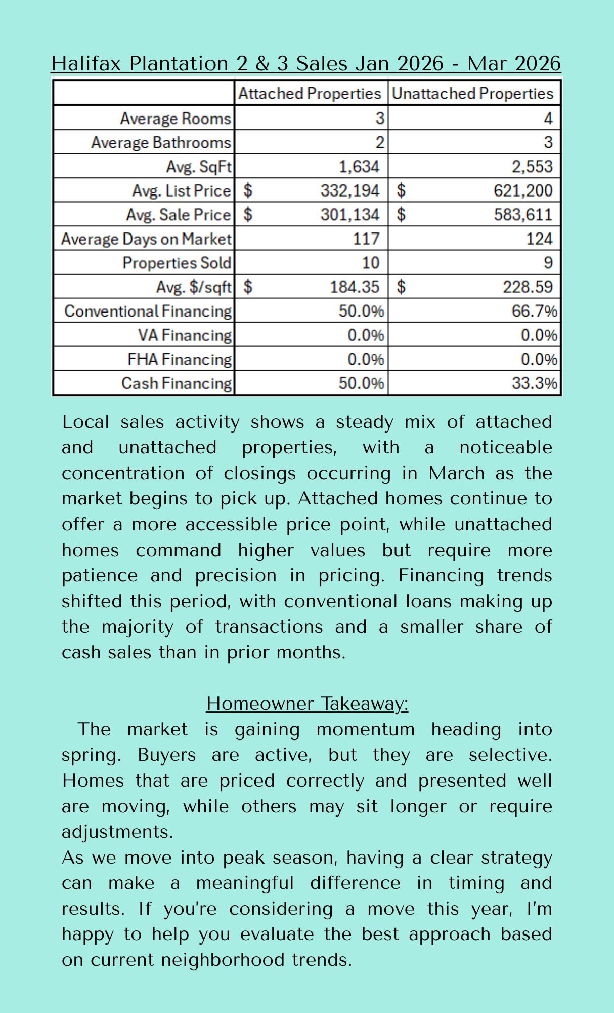 Local sales activity shows a steady mix of attached and unattached properties, with a noticeable concentration of closings occurring in March as the market begins to pick up. Attached homes continue to offer a more accessible price point, while unattached homes command higher values but require more patience and precision in pricing. Financing trends shifted this period, with conventional loans making up the majority of transactions and a smaller share of cash sales than in prior months.